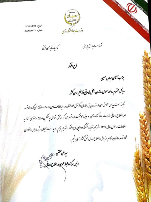 به گزارش پایگاه اطلاعرسانی سازمان جنگلها، مراتع و آبخیزداری کشور، مرکز روابط عمومی و اطلاعرسانی وزارت جهاد کشاورزی بر اساس بررسی پاسخگویی دستگاههای اجرایی در "سامانه انتشار و دسترسی آزاد به اطلاعات"، سازمان جنگلها، مراتع و آبخیزداری را حائز رتبه برتر شناخت و لوح افتخار را به عباس سمیعی مدیر کل دفتر روابط عمومی و امور بینالملل اعطا نمود.